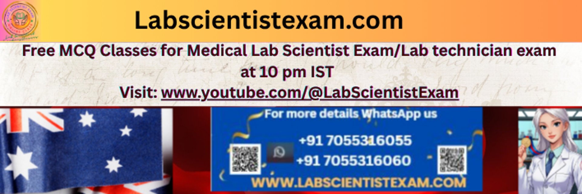 The Labscientistexam.com is an ultimate resource for your success in the AIMS (The Australian Institute of Medical Scientists) Exam, DHA (Dubai Health Authority) Exam, MOH (Ministry of Health) Exam, DHCA Exam, SMLE Exam, NHRA Exam and other paramedical exam for lab scientists and lab technicians. We offers comprehensive study materials, live online classes, practice questions, and mock exams.
